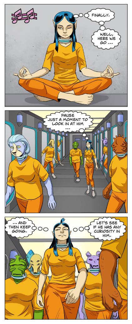 Eithne has stepped outside her cell, some other prisoners are coming up the corridor behind as she pauses to look in towards the K'Tagon's cell.